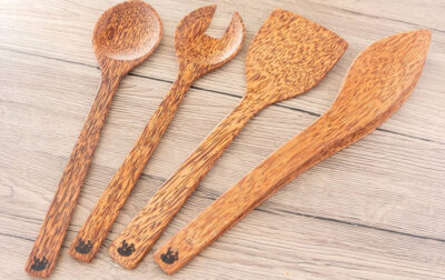 Mestoli in legno di palma da cocco naturale, ricavato da scarti di produzione e lavorato artigianalmente in Vietnam. Ottimo esempio sostenibile di riuso e upcycling: i pezzetti di legno sono recuperati dalla fabbrica di mobili del villaggio.